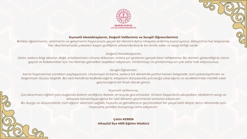 Kıymetli Öğrencilerimiz, Değerli Öğretmenlerimiz ve Saygıdeğer Velilerimiz, 2025–2026 eğitim öğretim yılının birinci dönemini, hep birlikte gösterdiğimiz emek, sabır ve özveriyle başarılı bir şekilde tamamlamış bulunuyoruz. Bir dönemi daha geride bırakırken eğitimin tüm paydaşlarına duyduğum teşekkür ve takdiri özellikle ifade etmek…