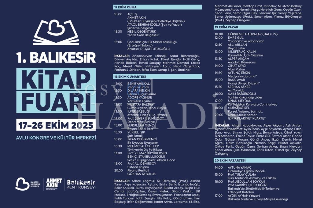 Balıkesir Büyükşehir Belediyesi tarafından bu yıl 17-26 Ekim tarihleri arasında ilk kez gerçekleştirilecek olan Balıkesir Kitap Fuarı, ünlü yazarları kitapseverlerle buluşturacak. Ataol Behramoğlu, Ayşe Kulin ve Prof. Dr. Yılmaz Büyükerşen’in onur konuğu olacağı kitap fuarında Cumhuriyetin kültürel birikimi ve aydınlanma…