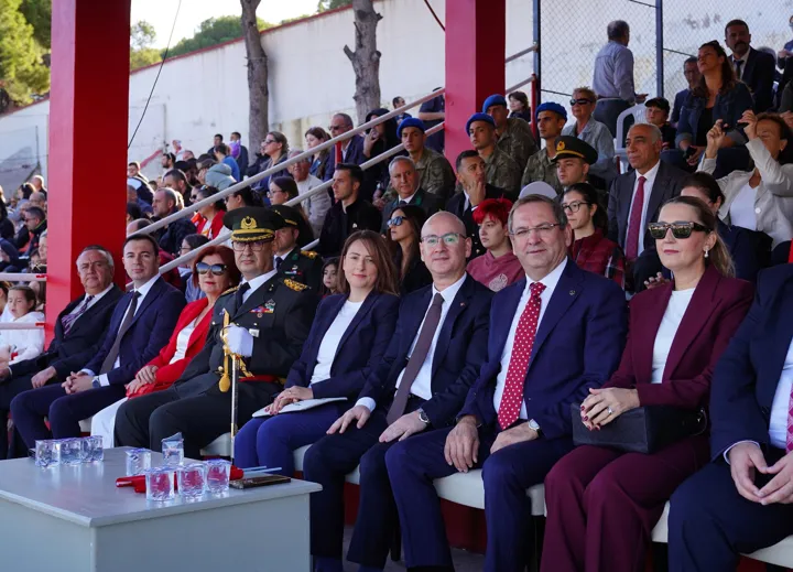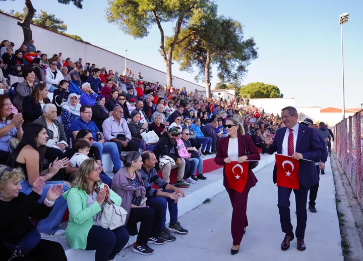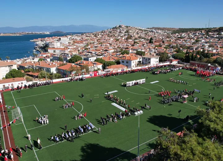 Hüsnü Uğural Stadyumu’nda; Ayvalık Anadolu Lisesi (AYAL) okul idarecileri, öğretmenleri ve öğrenciler tarafından düzenlenen törende; Ayvalık Kaymakamı Hasan Yaman ve Ayvalık Belediye Başkanı Mesut Ergin’in öncülüğündeki protokol üyeleri stadı adeta hınca hınç dolduran vatandaşların Cumhuriyet Bayramı’nı kutladı, büyük coşkuya ortak oldu.
