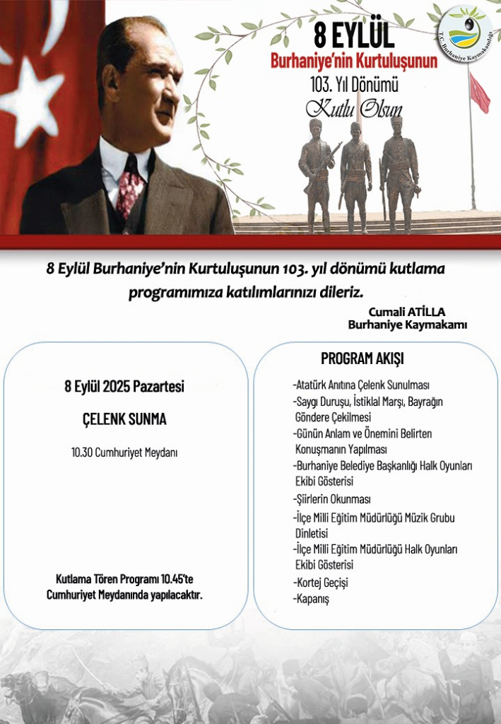 Burhaniye’nin düşman işgalinden kurtuluşunun 103. yıl dönümü, 8 Eylül 2025 Pazartesi günü düzenlenecek tören ve etkinliklerle coşkuyla kutlanacak.