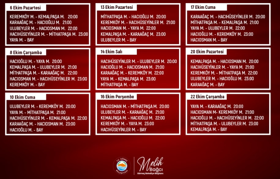 Maçlar 6-8-10-13-14-16-17-20 ve 22 Ekim tarihlerinde saat 20.00, 21.00, 22.00 ve 23.00’te Gömeç Sahası’nda oynanacak.
