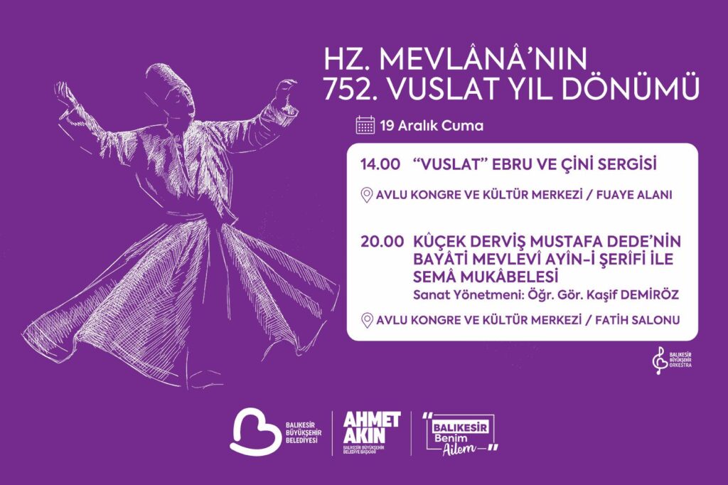 Balıkesir Büyükşehir Belediyesi tarafından Hz. Mevlana’nın 752. Vuslat yıl dönümü nedeniyle 19 Aralık Cuma günü “Vuslat” Ebru ve Çini Sergisi ile “Derviş Mustafa Dede’nin Bayâti Mevlevî Ayin-i Şerîf’i ile Semâ Mukabelesi” etkinlikleri gerçekleştirilecek.